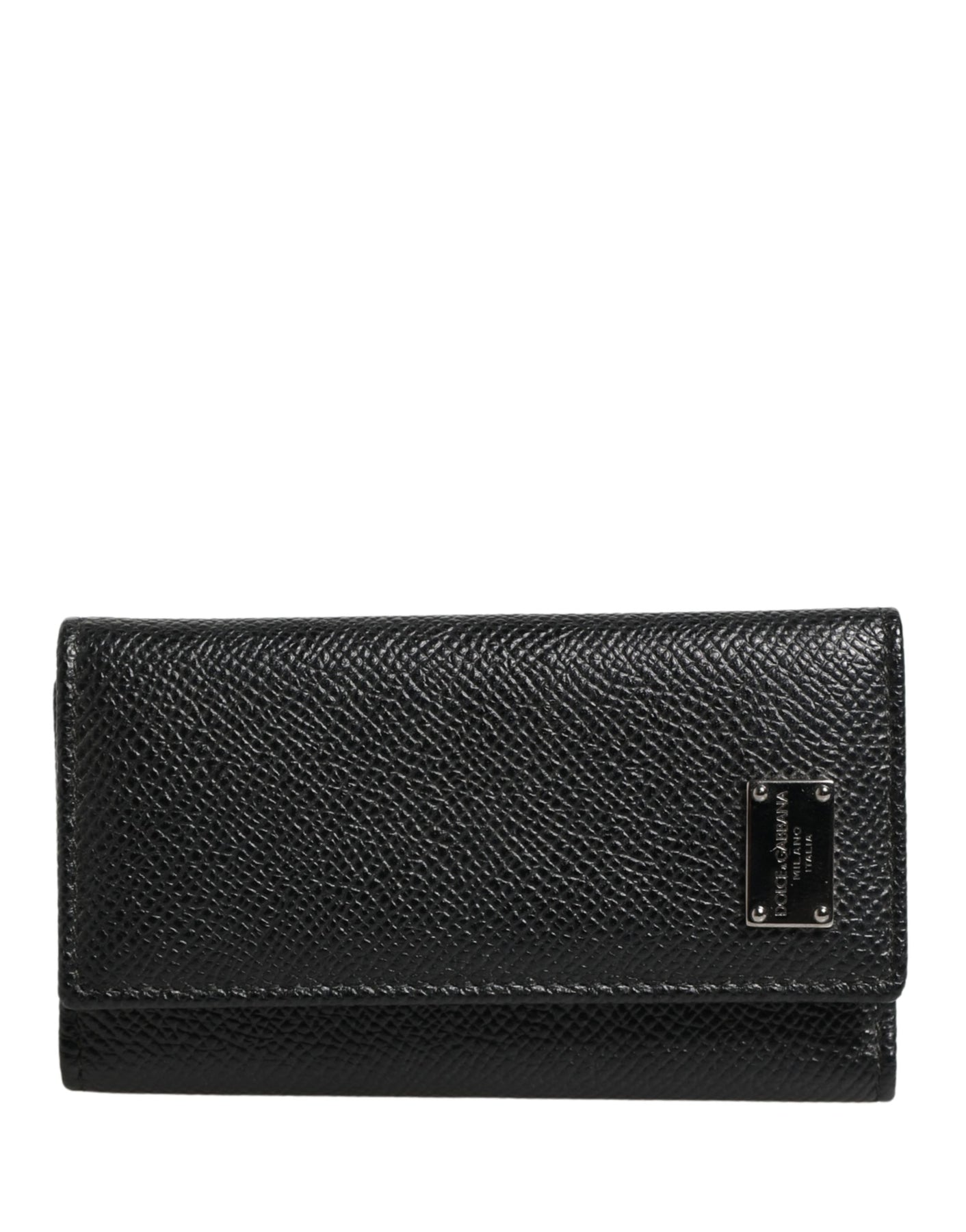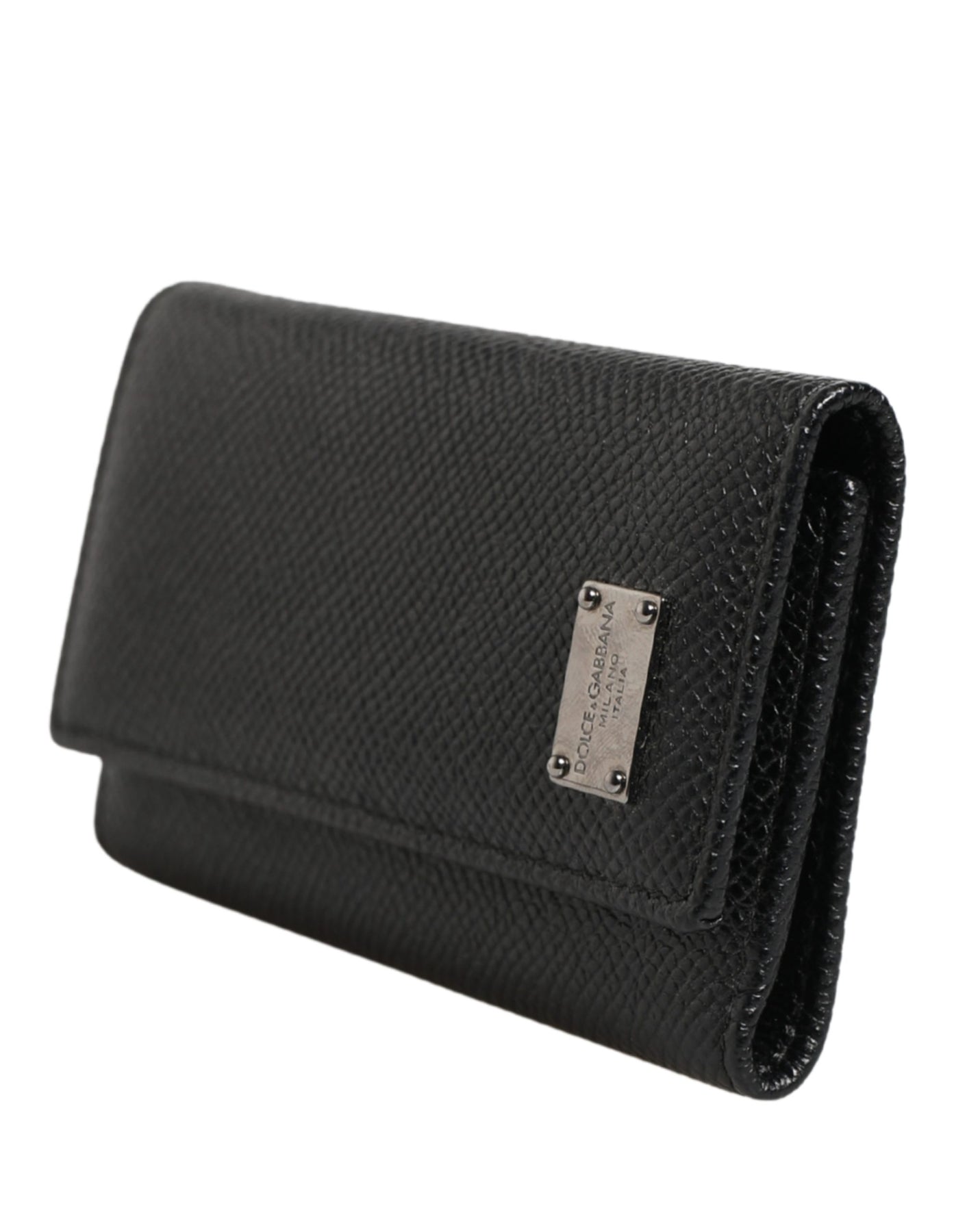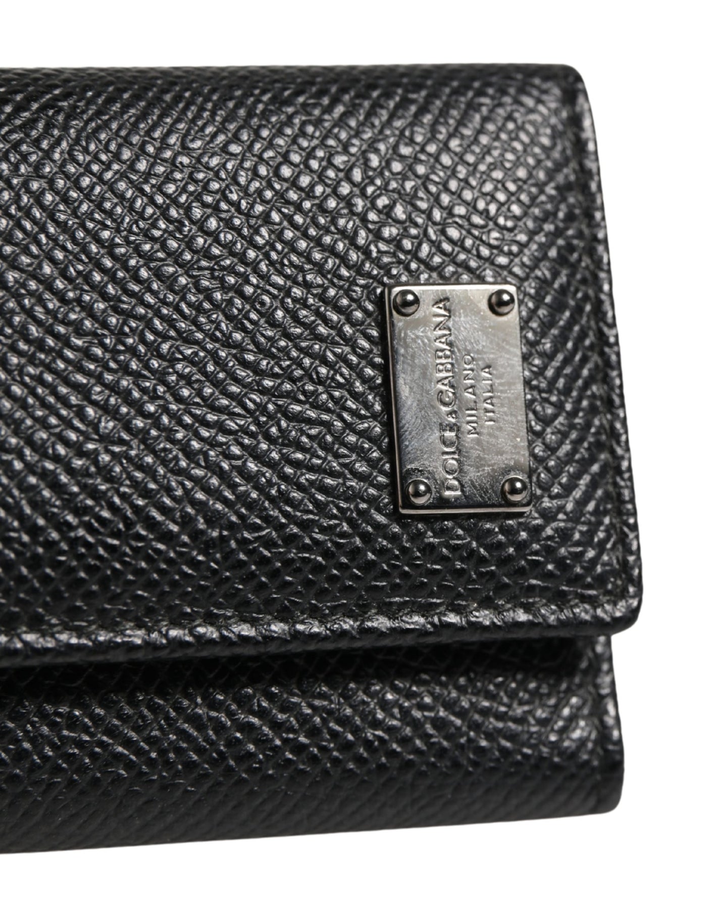 Dolce & Gabbana Black Leather Silver Metal Logo Plaque Trifold Keyring