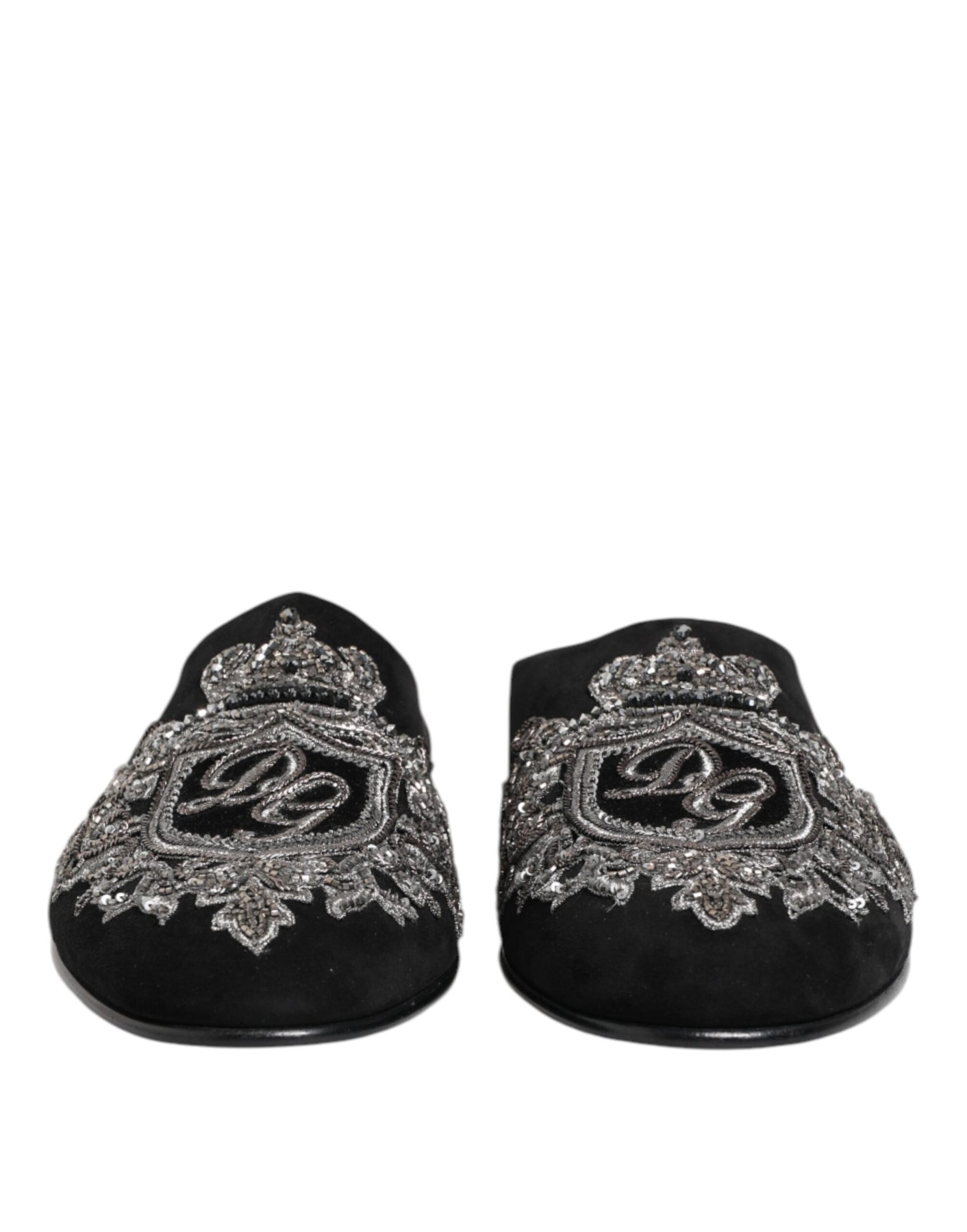 Dolce & Gabbana Black Velvet Slides DG Crown Slipper Shoes