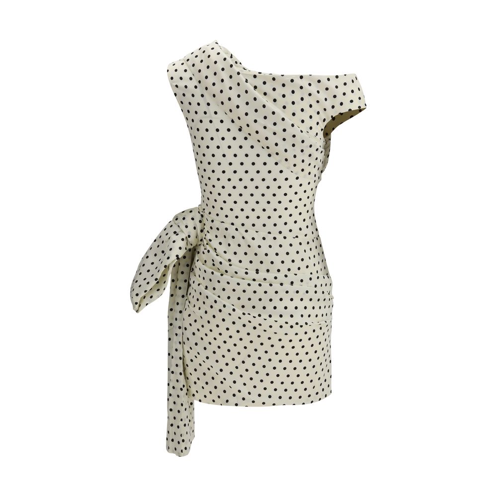 The polka dot satin mini Dress by Self Portrait blends vintage-inspired accents with fluid draping for a dramatic yet refined effect. Crafted from lightweight satin with a subtle sheen, it features a fitted silhouette with minimal stretch that enhances the figure. Asymmetric draping and gathering details add depth and movement, while the eye-catching side bow brings a feminine focal point. Finished with a concealed side zip closure, this mini dress pairs perfectly with stilettos for an elegant evening look.