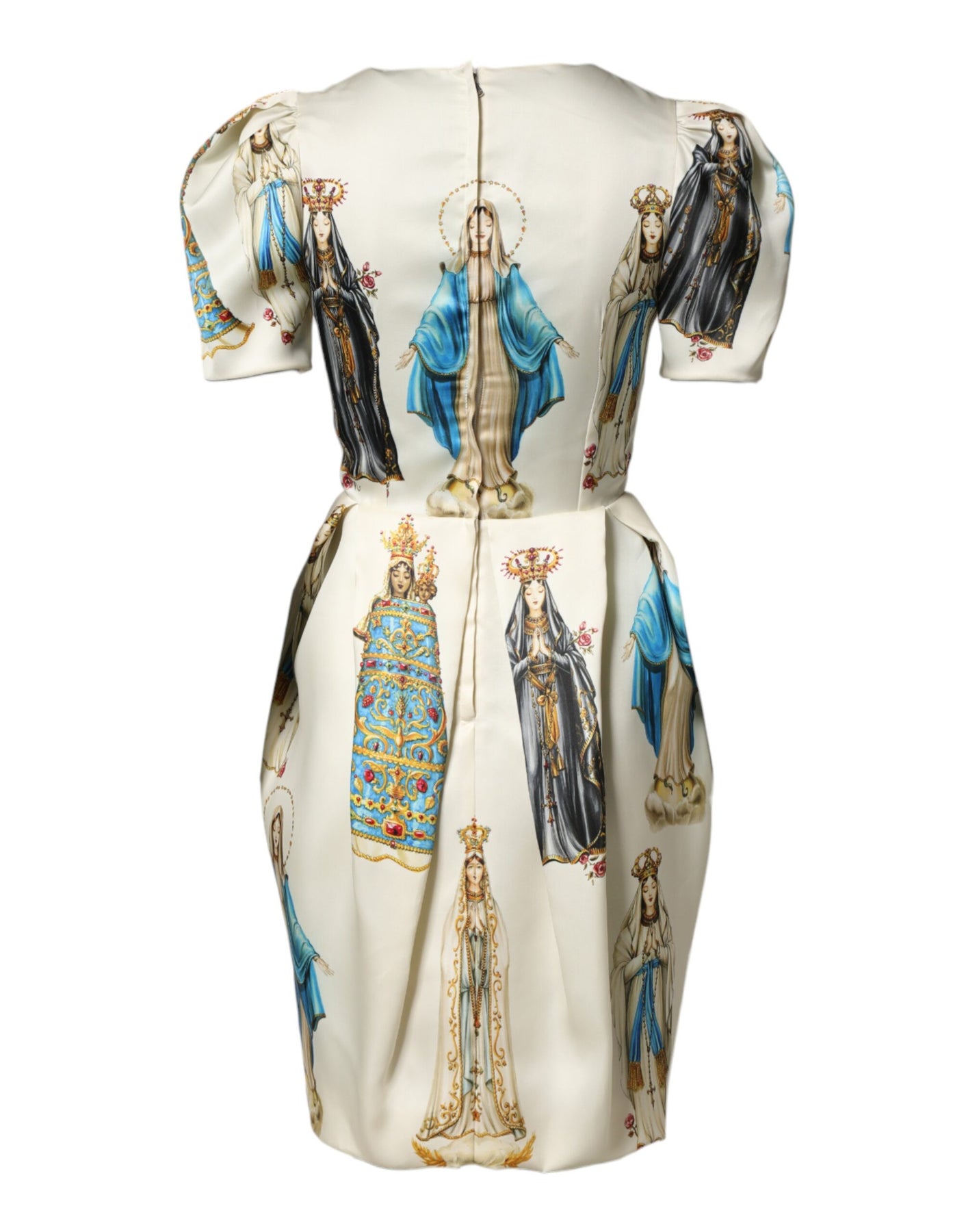 Dolce & Gabbana Beige Madonne Print Silk Short Sleeve Dress