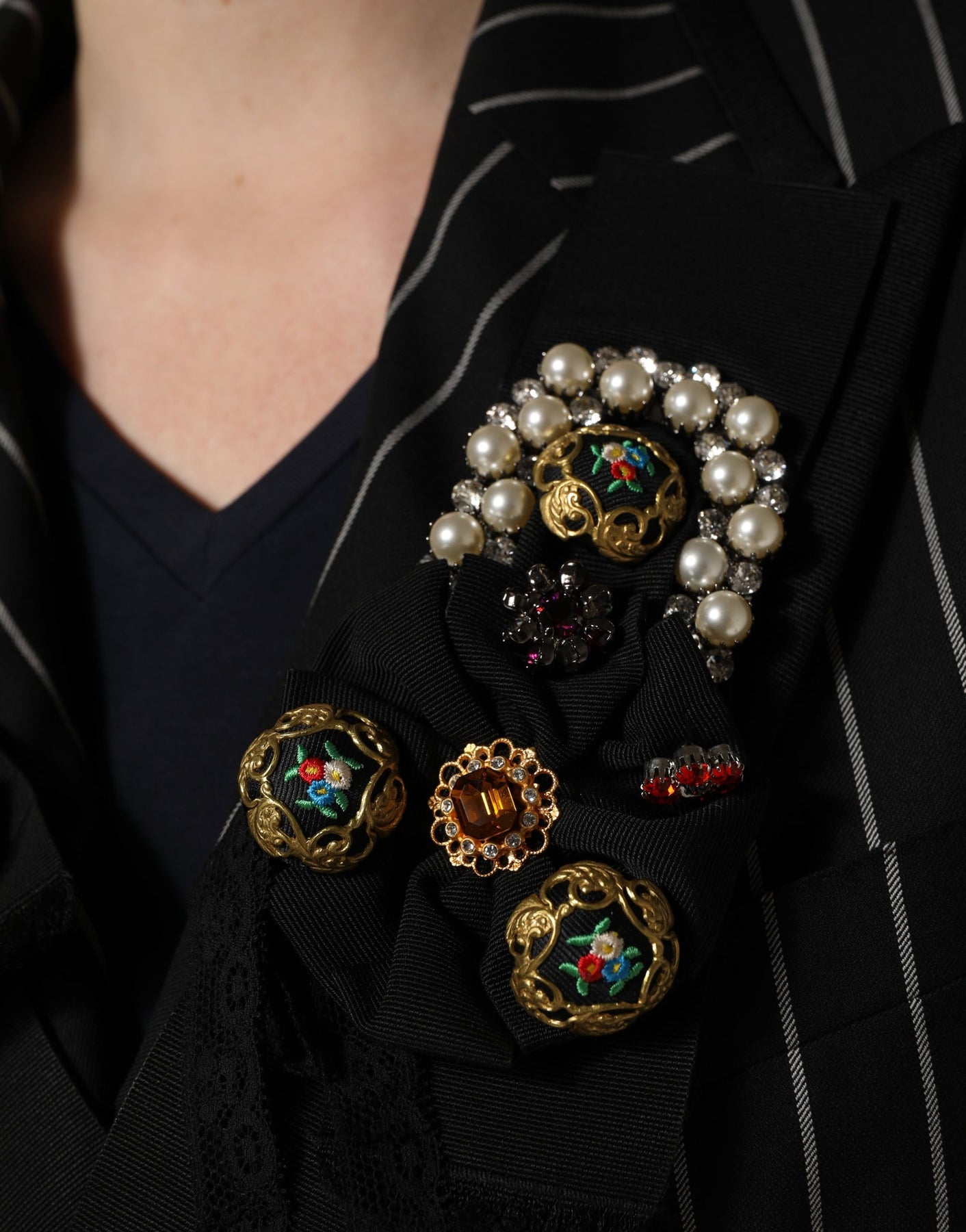 Gorgeous brand new, 100% Authentic Dolce & Gabbana pinstripe double-breasted blazer crafted from fine wool and elevated with floral appliqué detailing, offering a refined balance of classic tailoring and artistic embellishment. The silk lining ensures a smooth, luxurious finish and comfortable wear.