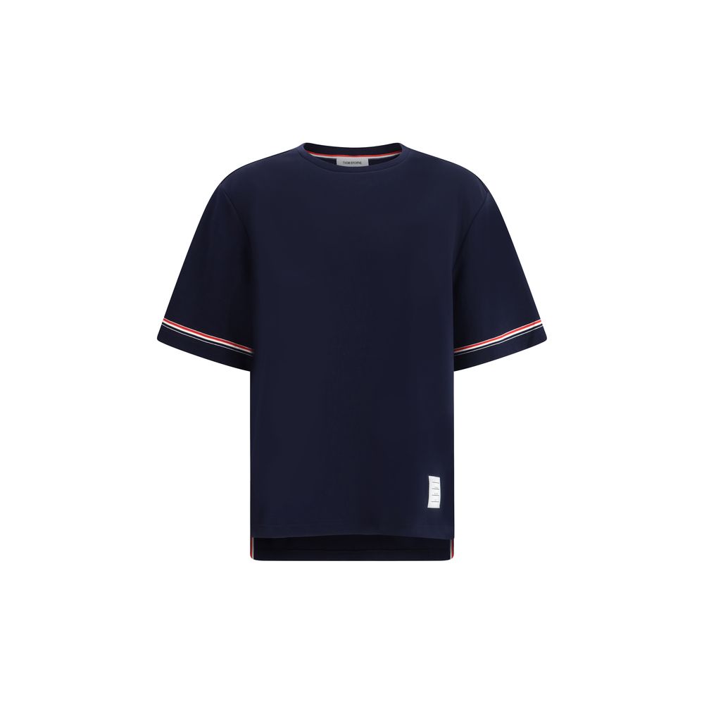 Thom Browne’s cotton T-Shirt features a ribbed collar and a distinctive design with the iconic colored bands on the sleeves, echoing the brand’s signature style. On the front, the iconic monogram patch adds an exclusive touch. The side slits, also decorated with the iconic bands, add versatility and a modern touch to the garment. The monochrome pattern makes this T-shirt easy to pair with different looks, offering the perfect balance between casual elegance and sophisticated details.