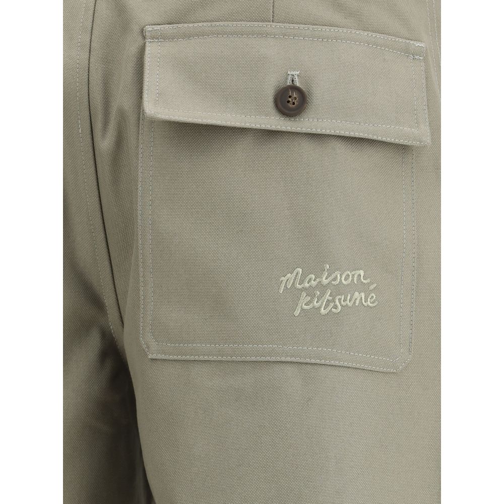 Cotton Workwear Pants by Maison Kitsuné, front zipper and button closure, two welt patch pockets on front, two welt flap patch pockets on back with iconic embroidered brand monogram detail, waistband loops, monochrome pattern, regular fit.