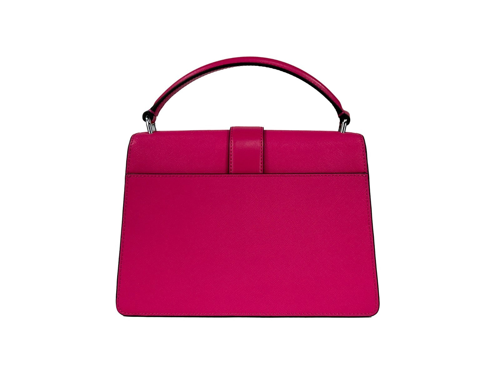 The elegant silver-tone hardware adds a touch of sophistication, while the back slip pocket offers convenient storage for essentials. The adjustable crossbody strap, featuring a stunning pink color, provides versatility in styling, whether worn across the body or on the shoulder. The spacious interior is lined with fabric and includes inner pockets for organized storage.
