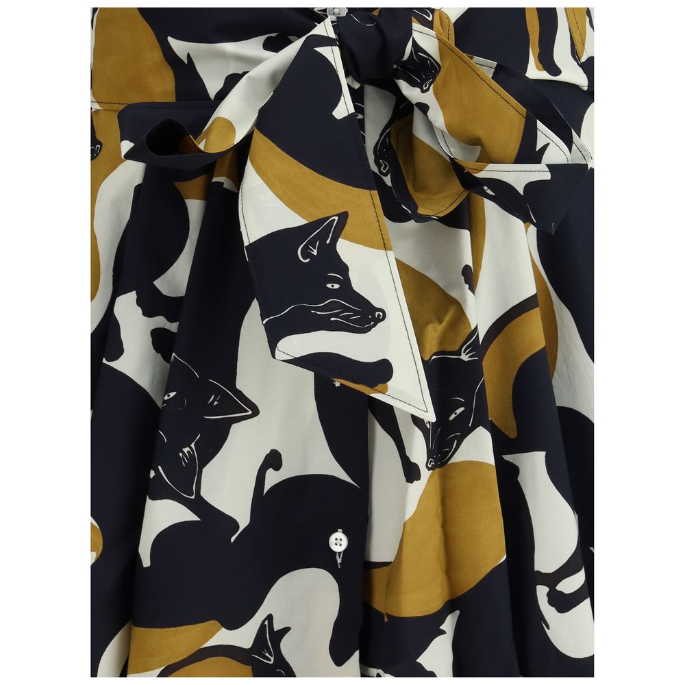 Sara Roka's chemisierjurk combineert een klassieke snit met een sterk karakter. Met een klassieke kraag, knoopsluiting aan de voorkant en korte mouwen onderscheidt hij zich door een opvallende print geïnspireerd op een wolvenpatroon. Het uitlopende patroon geeft het silhouet beweging en vrouwelijkheid.