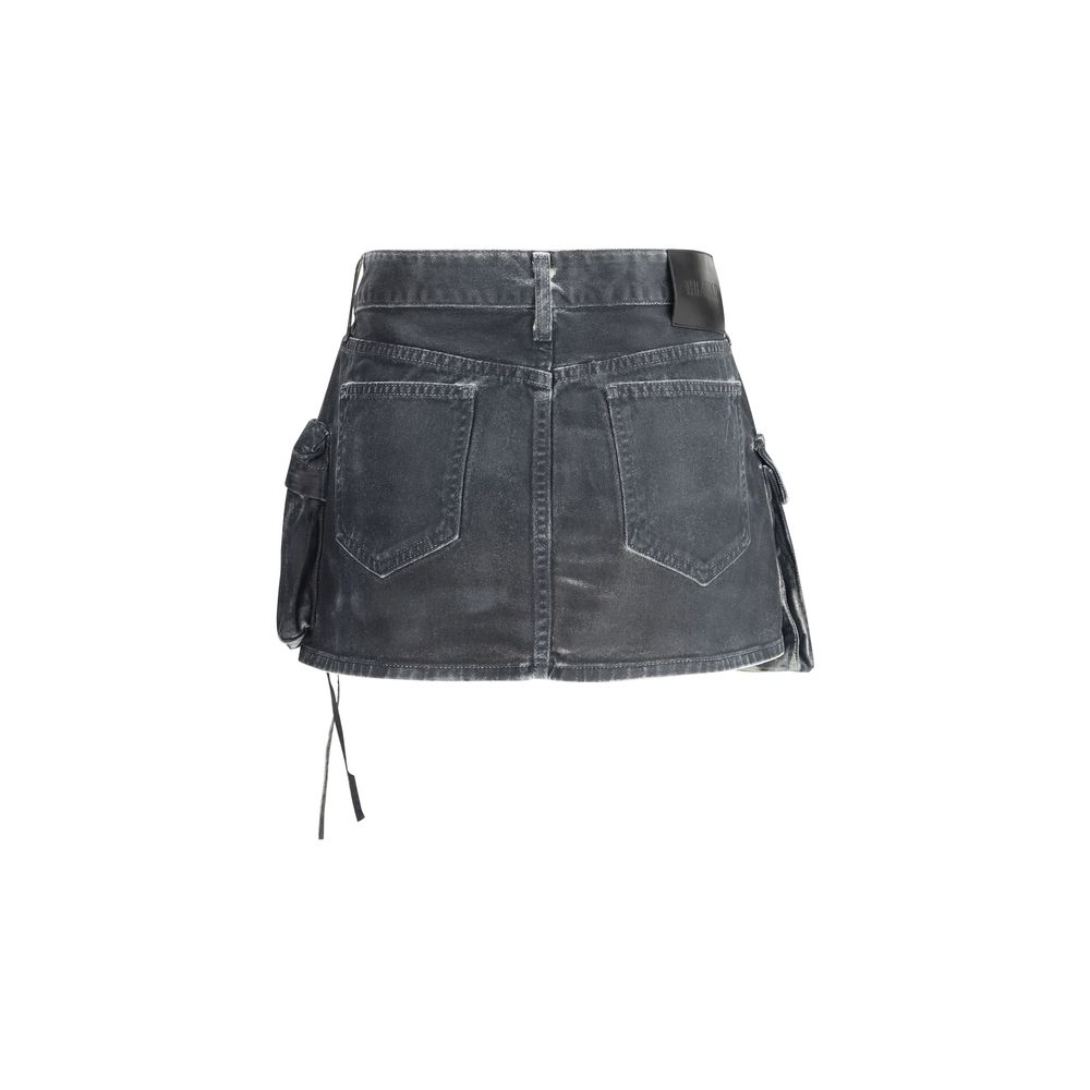 Denim Cargo Minirok van The Attico, model met vijf zakken, sluiting met knoop en ritssluiting aan de voorkant, riemlussen in de taille, iconische merklogo-embleem van leer met drukstempel op de achterkant, opgezette cargozakken aan de voorkant en de zijkanten.