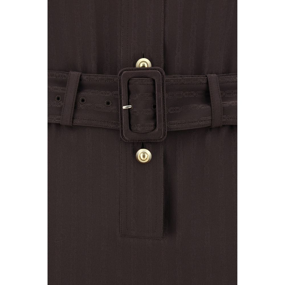 De lange chemisierjurk van Tom Ford is een verfijnd en veelzijdig kledingstuk met een strakke ronde hals en een knoopsluiting aan de voorkant. De verstelbare tailleband met een afneembare riem zorgt voor een persoonlijke pasvorm, terwijl de lange mouwen met knoopjes een praktische en stijlvolle touch toevoegen. De twee opgestikte zakken met klep en knoopjes aan de voorkant, samen met de twee paspelzakken aan de zijkanten, bieden functionaliteit en verfijnde details. Een elegante split aan de achterkant zorgt voor beweging in de jurk, die is voorzien van een verticaal patroon dat zich over het hele oppervlak herhaalt voor een visueel verlengend effect.