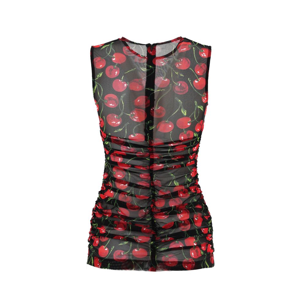 Dolce & Gabbana Cherry Print Black Tulle Sleeveless Top. Rounded front and back, sleeveless, gathered draped sides, round neckline, and back zip closure.